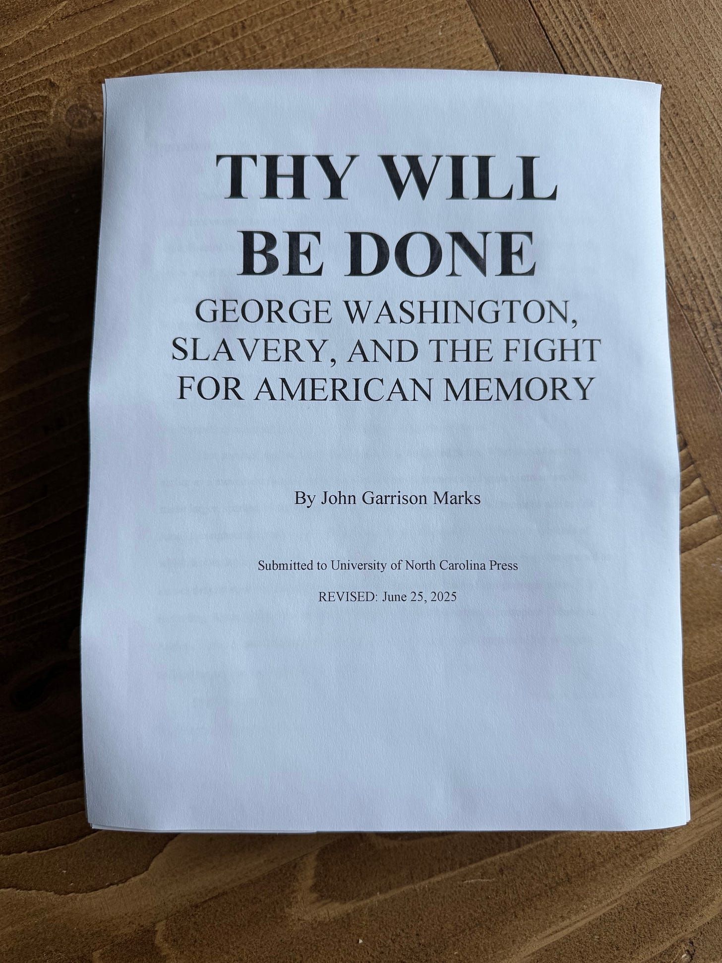 It’s titled Thy Will Be Done: George Washington, Slavery, and the Fight for American Memory. It tells the story of Americans’ centuries-long fight over slavery’s proper place in George Washington’s legacy. In it, I explore how generations of Americans—abolitionists, educators, activists, politicians, even Washington’s former slaves and their descendants—have all fought over how to understand Washington’s history with slavery, wielding their interpretation of the past in their efforts to win the arguments of the present.